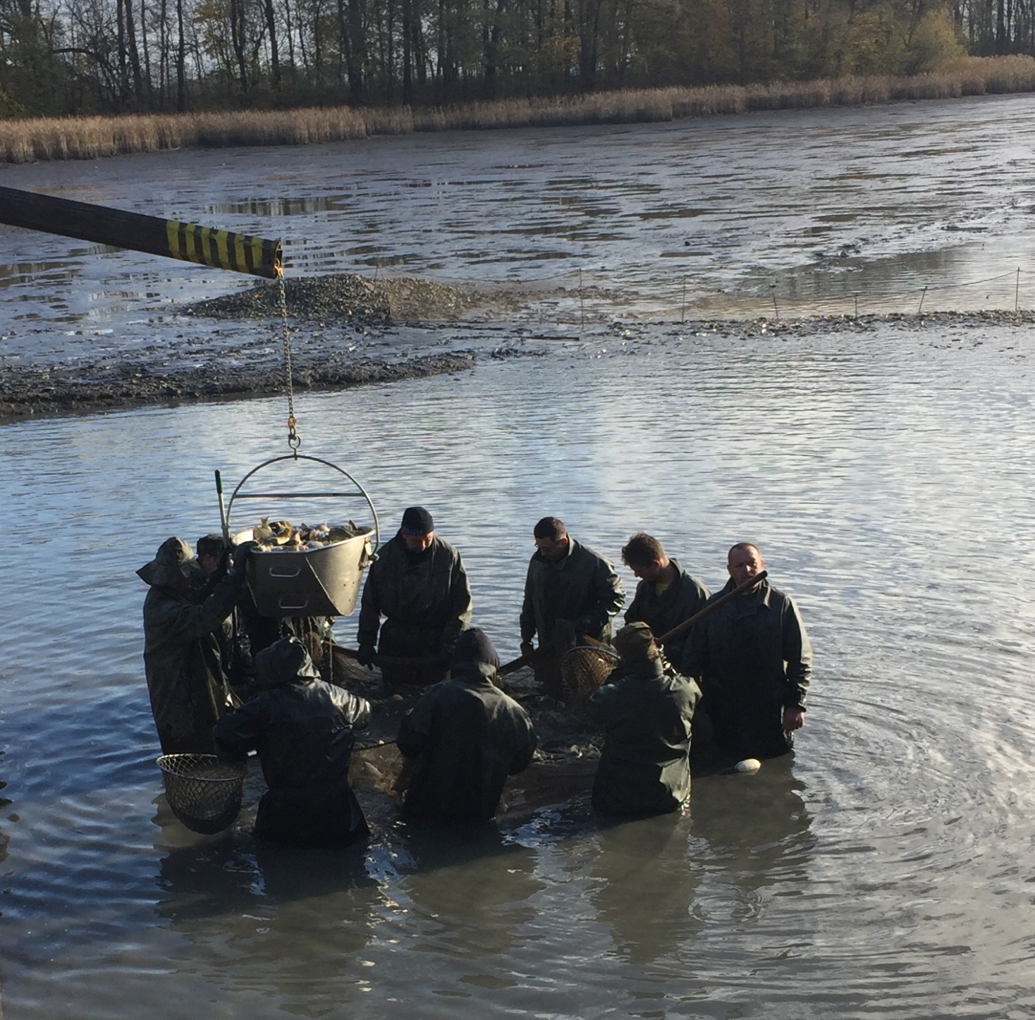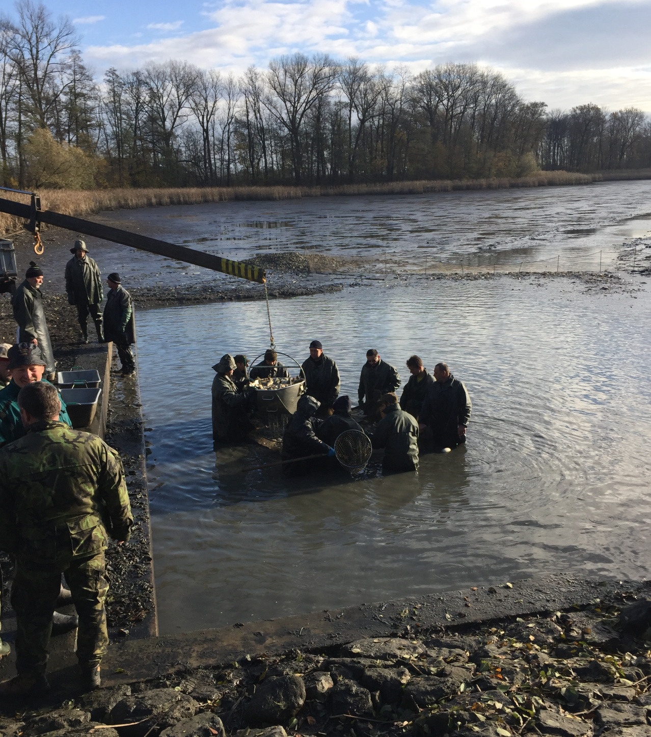 V sobotu 11.listopadu se lovil poslední z našich hlavních velkých rybníků. Začátek  ráno o sedmé hodině, lovící parta připravená ve vodě a poté několik zátahů, kdy bylo možné v odpoledních hodinách považovat rybník za vylovený. Připravené auta odvážely ryby na místo určení, nejvíce jich směřovalo k přezimování do komorového rybníku.